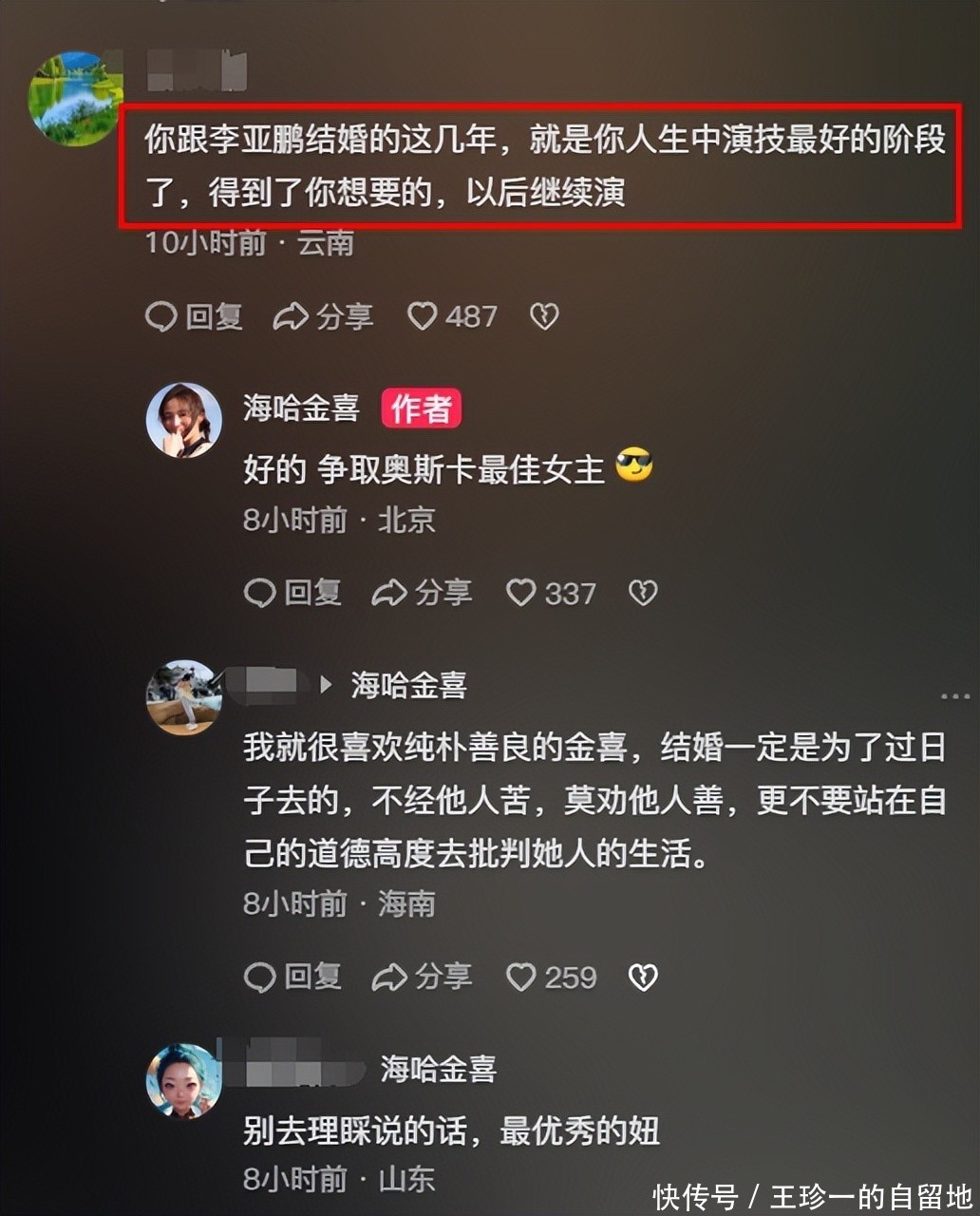 有网友说海哈金喜和李亚鹏在一起的几年,是她人生中演技最好的阶段,说她得到了她想要的,让她以后继续演。
