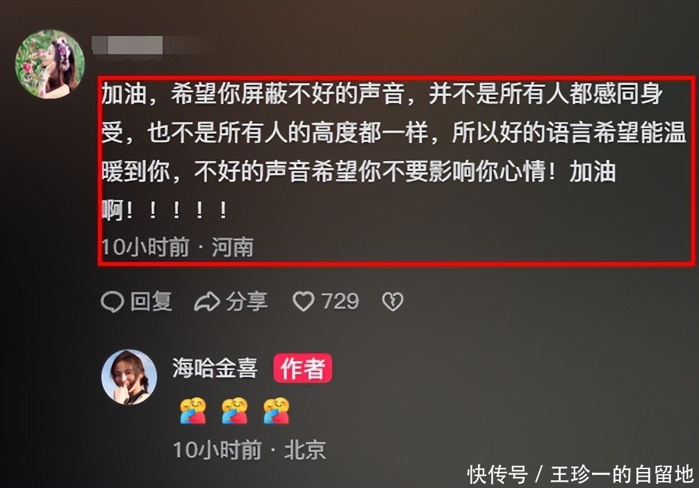有网友怕海哈金喜看到这样恶意满满的留言会伤心,特意留言安慰海哈金喜。海哈金喜用拥抱的表情回复了关心她的网友,表达了感谢。
