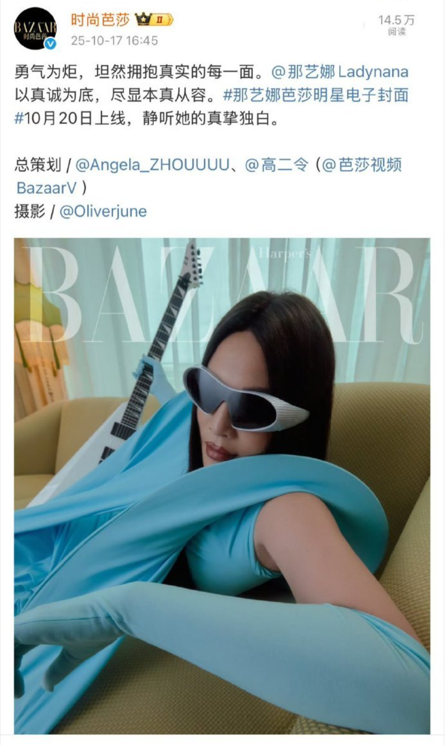 10月17日,《时尚芭莎》官宣网红女歌手那艺娜(LadyNana)为电子刊封面人物。18日,记者查询《时尚芭莎》微博账号,相关宣传物料不可见。