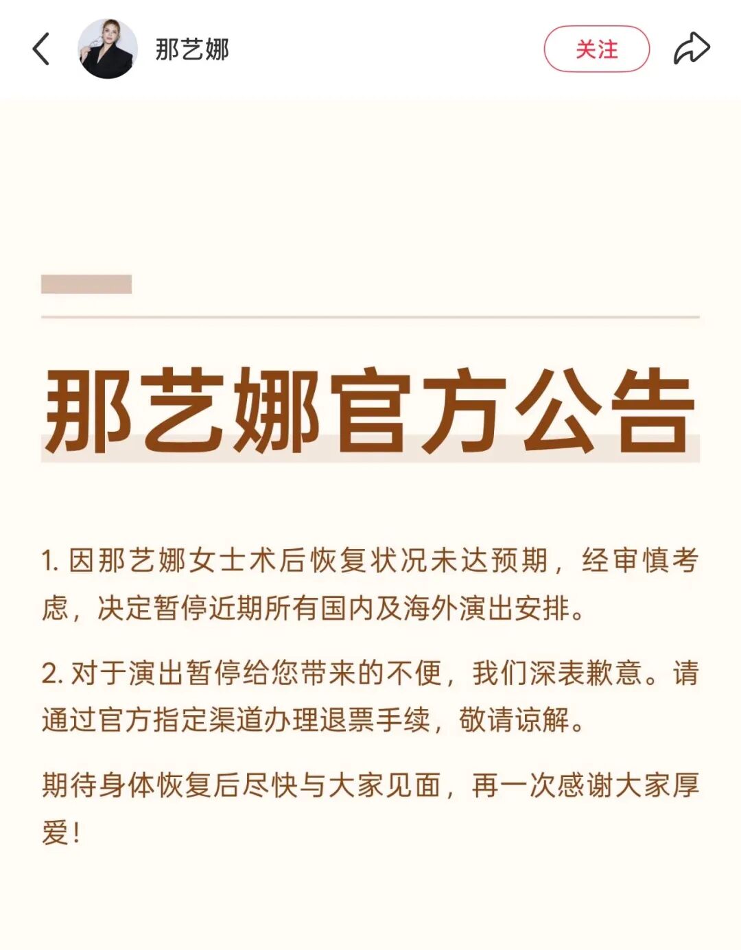 10月13日,那艺娜方发布官方公告:因那艺娜女士术后恢复状况未达预期,经审慎考虑,决定暂停近期所有国内及海外演出安排。